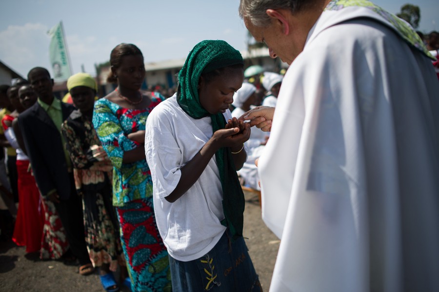 Read moreA Congolese woman takes communion at an open-air church service where thousands of internally displaced persons are sheltering on the outskirts of Goma, on November 25, 2012. #