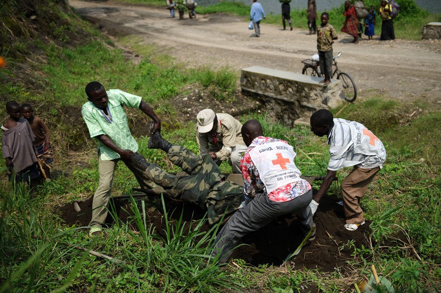 Read moreCongolese Red Cross volunteers place the corpse of a government army soldier into a freshly dug grave near Sake, DR Congo, on November 24, 2012. The Red Cross were working around Sake, clearing the bodies left from fighting on Thursday after M23 rebels clashed with the government army. #