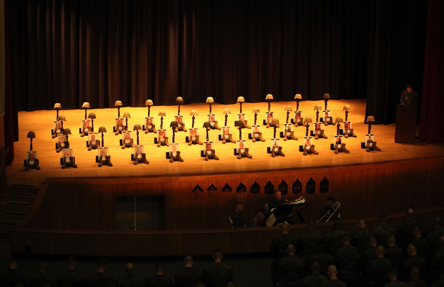 Read moreMarines and sailors look upon a stage of battle crosses memorializing fallen service members during a remembrance service at the movie theater aboard Marine Corps Base Camp Lejeune, North Carolina, on November 29, 2012. During the service, those in attendance paid their respects to the 31 Marines, sailors and Georgian soldiers who died while serving under Regimental Combat Team 6. #