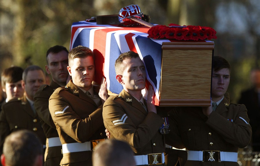 Read moreSoldiers from the Royal Regiment of Scotland carry the coffin of Captain Walter Barrie after his funeral service at Glencorse Kirk near Edinburgh, Scotland, on November 29, 2012. Captain Barrie, of The Royal Scots Borderers, 1st Battalion The Royal Regiment of Scotland (1 Scots), was playing in a soccer match between British soldiers and members of the Afghan National Army (ANA) on Remembrance Day at their base in Helmand province in Afghanistan, when he was shot by a rogue member of the Afghan army, according to local media. #
