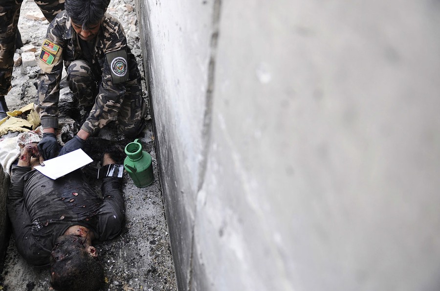 Click to view imageRead moreAn Afghan security officer takes fingerprints of a dead body at the scene of a suicide attack in Wazir Akbar Khan district of Kabul, on November 21, 2012. A suicide bomber blew himself up near a NATO base in Kabul's diplomatic district, hitting a military vehicle and killing two people, police and security officials said. #
