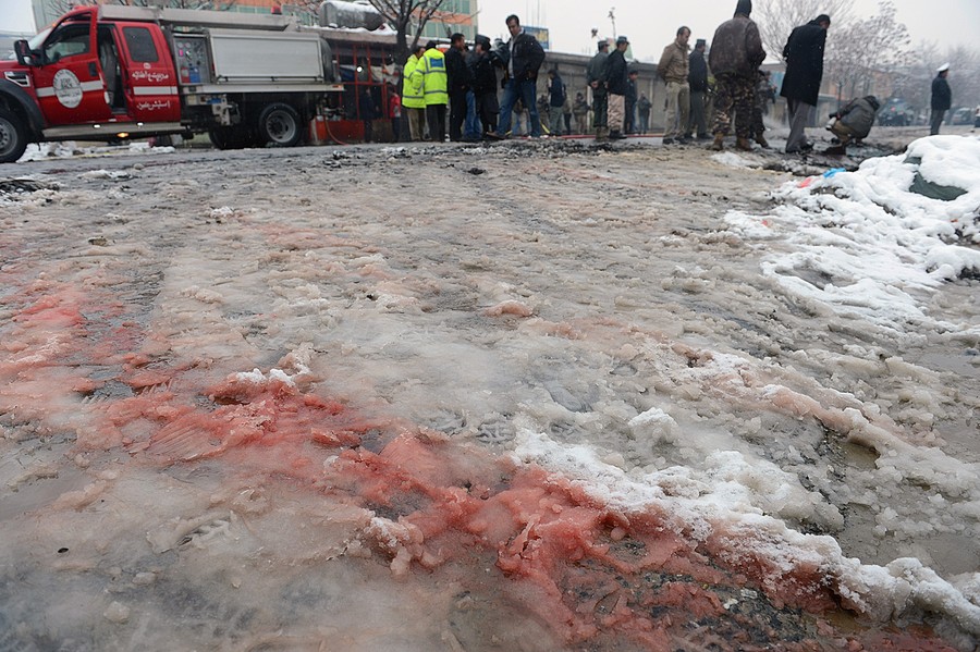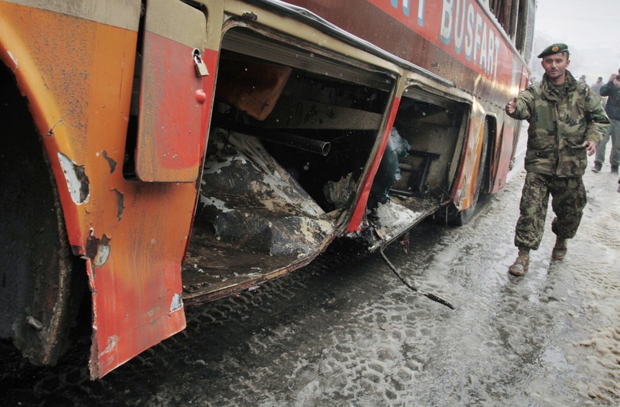 Read moreAn Afghan soldier walks by a damaged bus being pulled by a crane following a suicide attack in Kabul, on February 27, 2013. A man wearing a black overcoat and carrying an umbrella as a shelter against the heavy snow crossed a street in the Afghan capital early Wednesday morning toward an idling bus filled with Afghan soldiers, where he laid down and wiggled underneath. Then he exploded, engulfing the undercarriage of the bus in flames. #