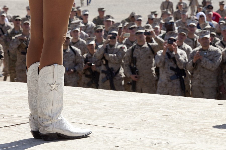 Read moreU.S. Service members watch as Dallas Cowboys Cheerleaders Jackie Bob and Cassie Trammell perform during the 76th USO tour at Camp Leatherneck, Helmand province on March 1, 2013. #