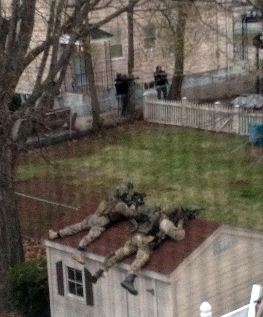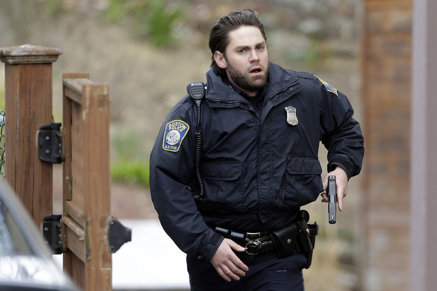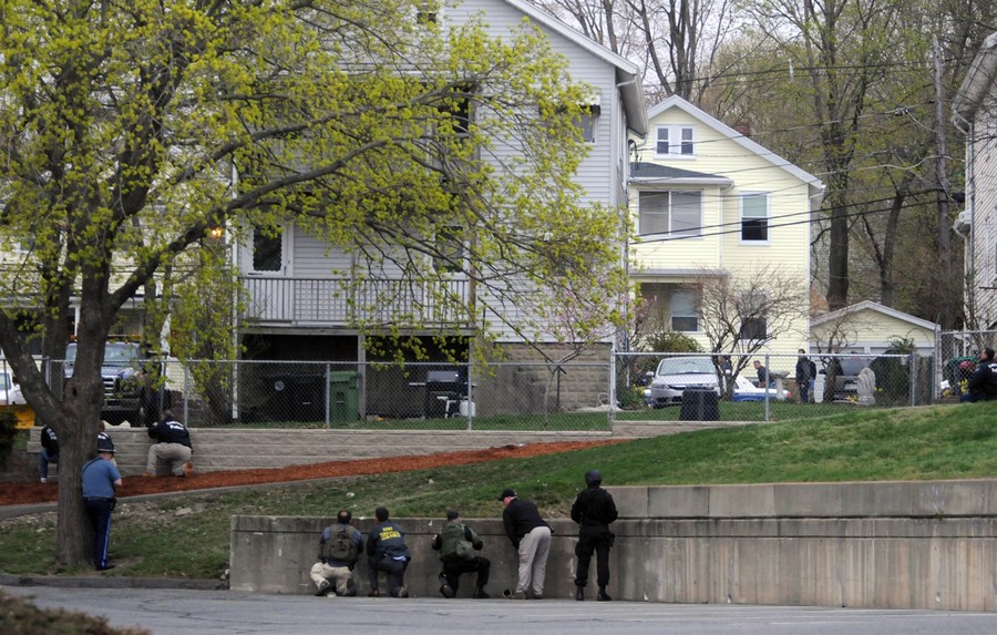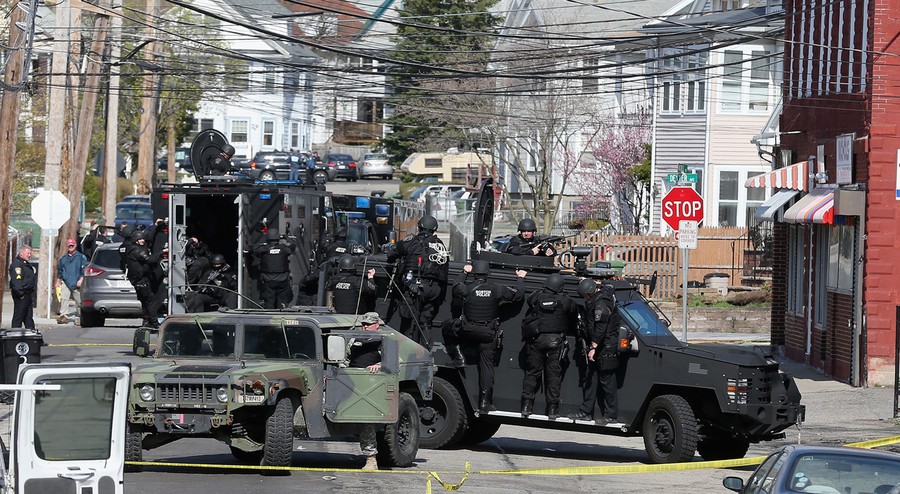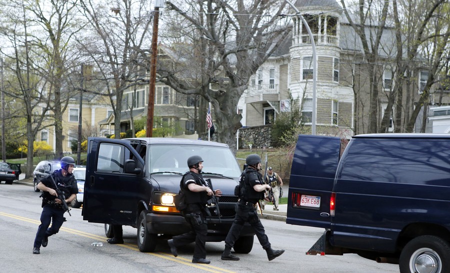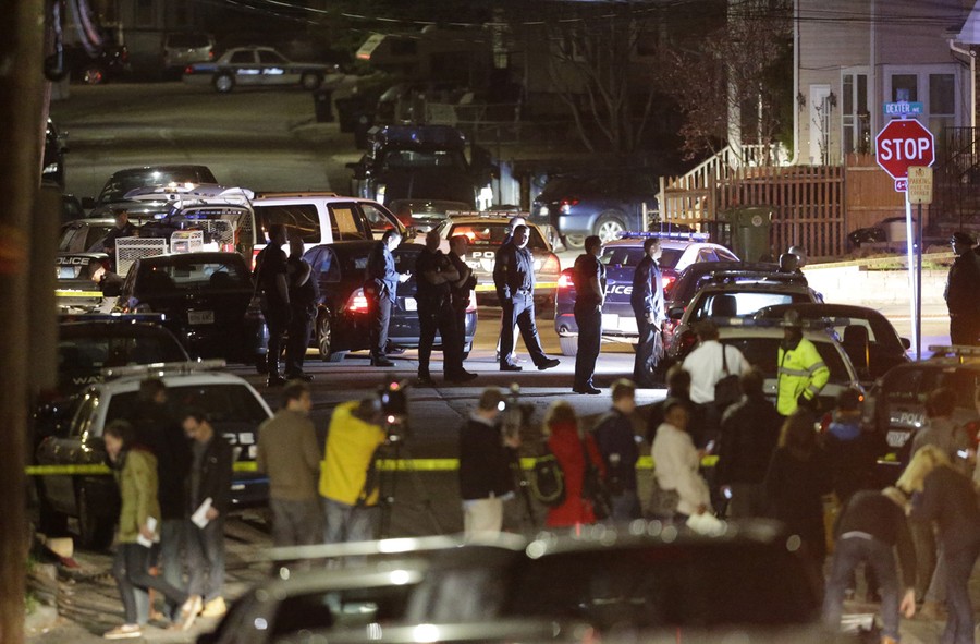 Hours after the FBI released images of the Boston Marathon bombing suspects, a response to a robbery in nearby Cambridge led to the fatal shooting of a Massachusetts Institute of Technology police officer. The shooting became a carjacking, then later a dangerous chase reportedly involving dozens of gunshots and explosive devices, ending up in neighboring Watertown. Authorities reported the shooting suspects were indeed the same men sought in the Boston Marathon bombing, identifying them as brothers Tamerlan Tsarnaev "Suspect #1" and Dzhokhar Tsarnaev "Suspect #2", both Kyrgyz nationals living in Cambridge. They later stated that Tamerlan, age 26, had been shot and killed, but younger brother Dzhokhar Tsarnaev, 19, was still at large. The manhunt intensified as the night went on, and the entire Boston area woke to find itself on lockdown, with public transportation shut down and citizens advised to stay indoors. Shortly before 7 p.m., shots were heard in Watertown, as Dzhokhar Tsarnaev was discovered hiding in a boat in the backyard of a residence. A brief standoff ended with the live capture of Dzhokhar, who is now in custody, 22 hours after the start of the manhunt, four days after the bombing.