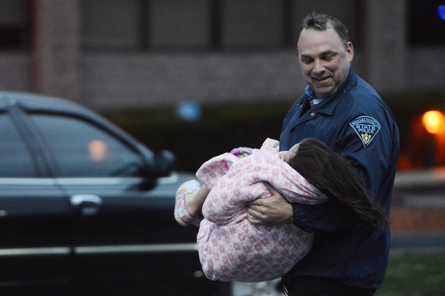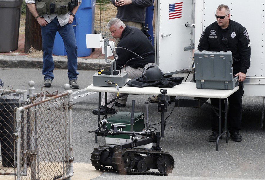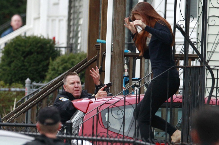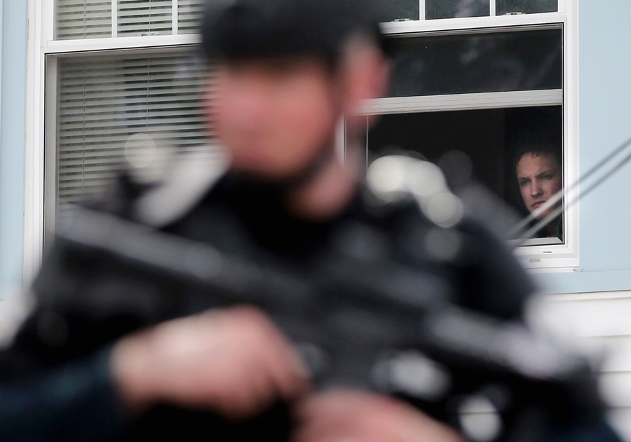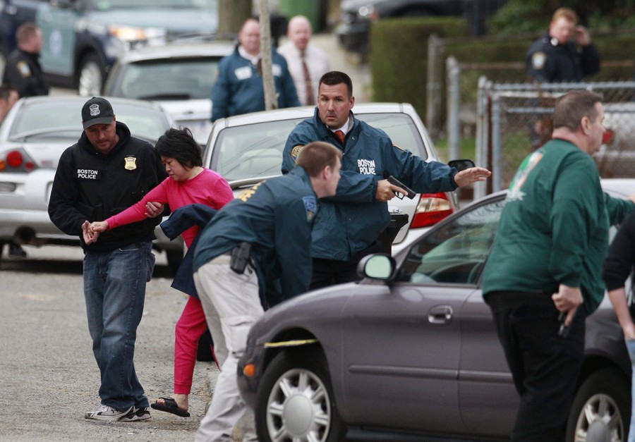 Hours after the FBI released images of the Boston Marathon bombing suspects, a response to a robbery in nearby Cambridge led to the fatal shooting of a Massachusetts Institute of Technology police officer. The shooting became a carjacking, then later a dangerous chase reportedly involving dozens of gunshots and explosive devices, ending up in neighboring Watertown. Authorities reported the shooting suspects were indeed the same men sought in the Boston Marathon bombing, identifying them as brothers Tamerlan Tsarnaev "Suspect #1" and Dzhokhar Tsarnaev "Suspect #2", both Kyrgyz nationals living in Cambridge. They later stated that Tamerlan, age 26, had been shot and killed, but younger brother Dzhokhar Tsarnaev, 19, was still at large. The manhunt intensified as the night went on, and the entire Boston area woke to find itself on lockdown, with public transportation shut down and citizens advised to stay indoors. Shortly before 7 p.m., shots were heard in Watertown, as Dzhokhar Tsarnaev was discovered hiding in a boat in the backyard of a residence. A brief standoff ended with the live capture of Dzhokhar, who is now in custody, 22 hours after the start of the manhunt, four days after the bombing.