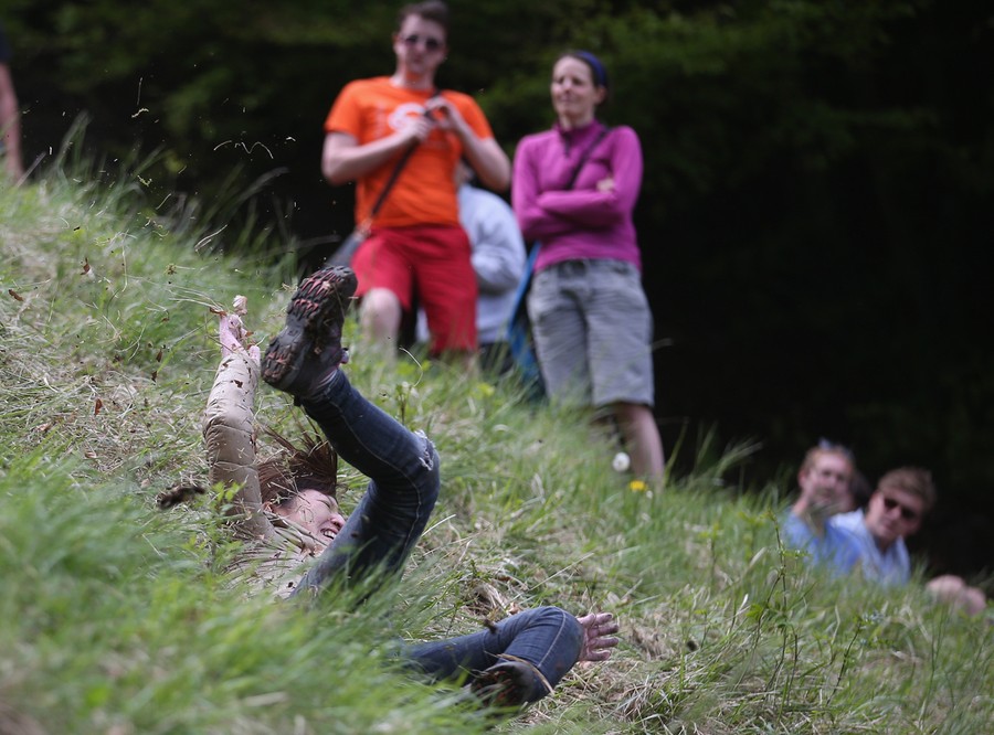 Read moreContestants in the men's race chase a Double Gloucester Cheese down the steep gradient of Cooper's Hill during the annual tradition of cheese-rolling on May 27, 2013 in Brockworth, Gloucestershire, England. Although no longer a officially organized event since 2009, thousands of spectators still gathered to watch contestants from around the world tumbling down the 200m slope, which has a 1:1 gradient in parts, in a series of races that are said to date back hundreds of years, with the winner of each receiving a cheese. Injuries such as broken arms and legs are commonplace. #