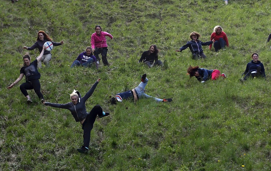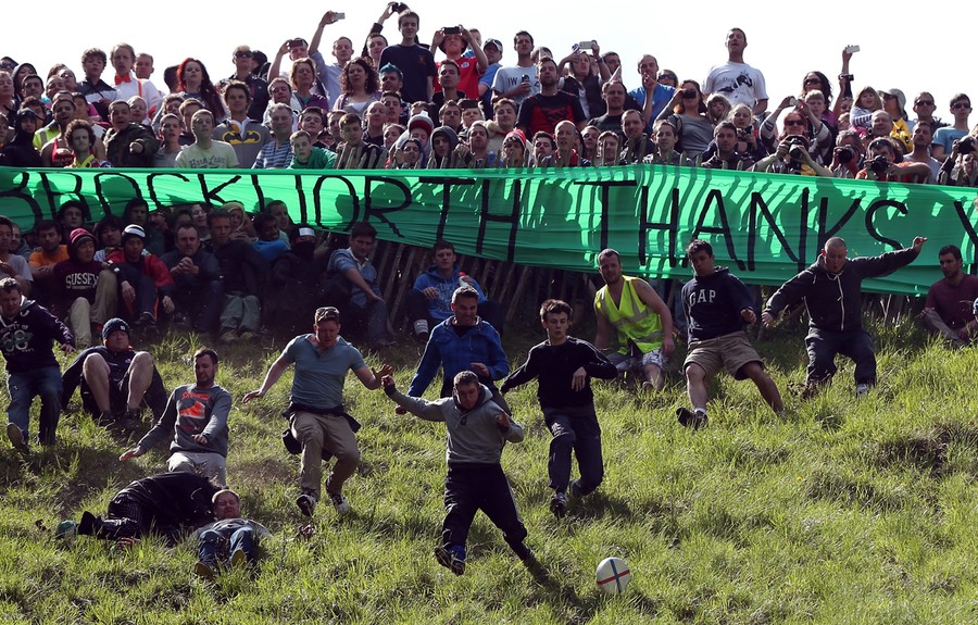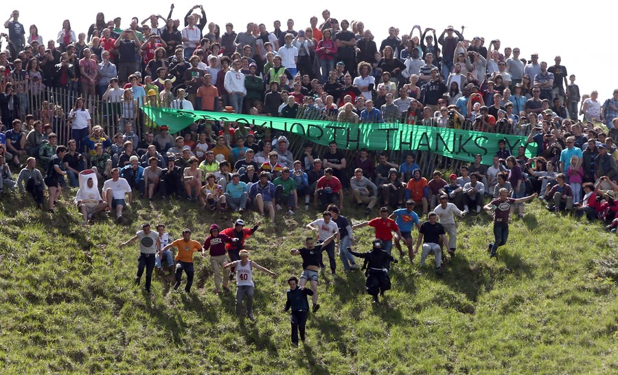 Yesterday, on a farm near Gloucester, England, thousands gathered for the annual Cooper's Hill Cheese-Rolling and Wake, continuing a tradition that dates back at least 200 years, despite recent warnings from police. In the event, groups of fearless racers risk life and limb chasing an 8 pound (3.5 kg) round of Double Gloucester Cheese down an extremely steep and uneven hill, with a 1:1 gradient in some sections. The last officially organized race was in 2009, since then, it has continued unofficially every year, despite the potential for serious injury. Earlier, local police warned cheese-maker Diana Smart, who has supplied cheese to the race for 25 years, that she may be construed as a race organizer, and therefore legally liable. The BBC reports that this year organizers replaced the cheese with a lightweight foam version, in order to make the race safer. The winner of the race takes home the cheese.