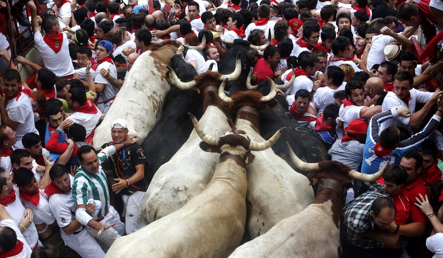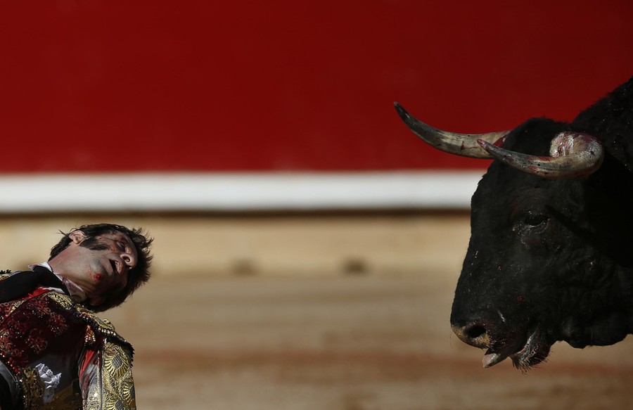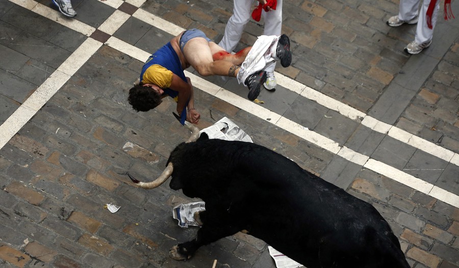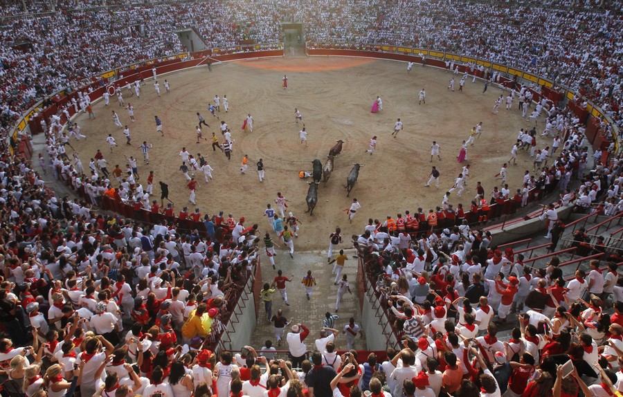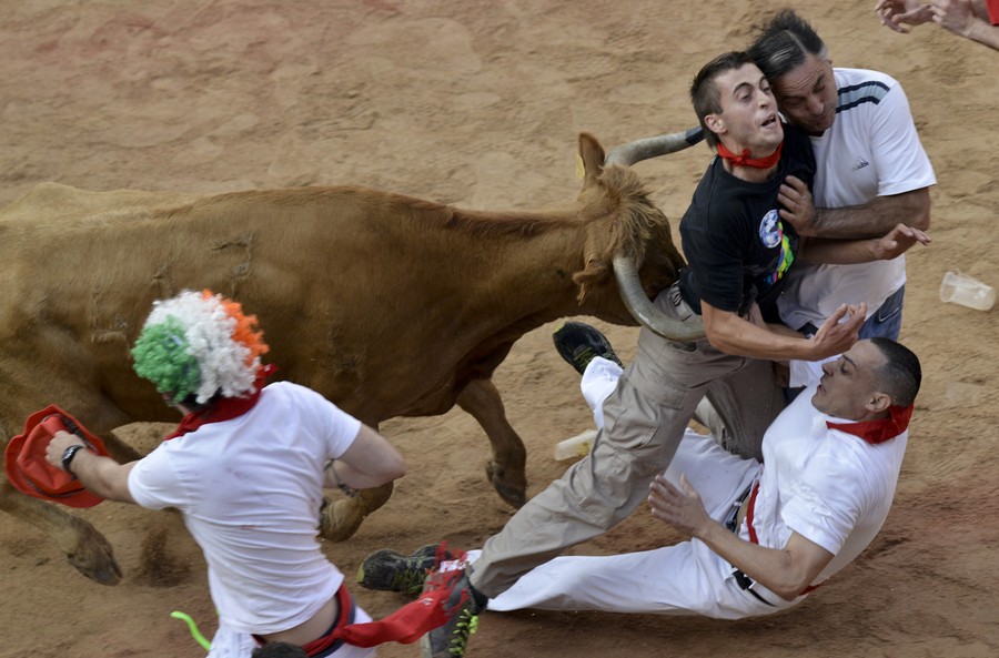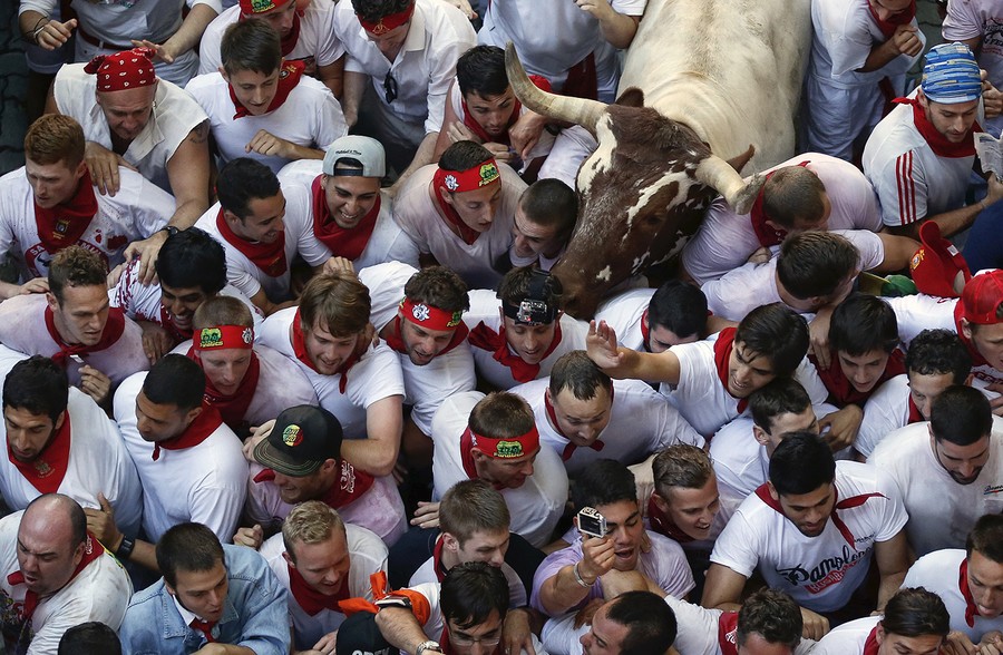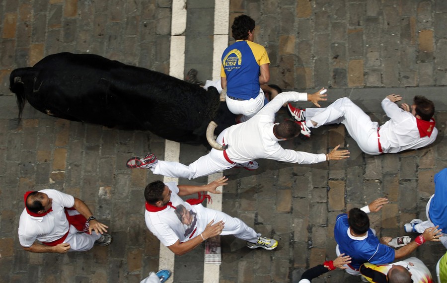 Every year, the Festival of San Fermin, including the "Running of the Bulls", attracts thousands of visitors to Pamplona, Spain. Lasting nine days, the festival kicks off with massive crowds at the Chupinazo in Pamplona town square, followed by a carnival, fireworks, the running of the bulls, and many bullfights. Held since 1591, San Fermin remains a popular, if also dangerous and controversial, event -- dozens of people were injured this year. The festival came to an end yesterday, July 14. Collected here are scenes from this year's Festival of San Fermin.