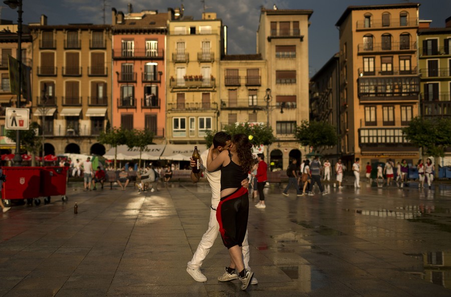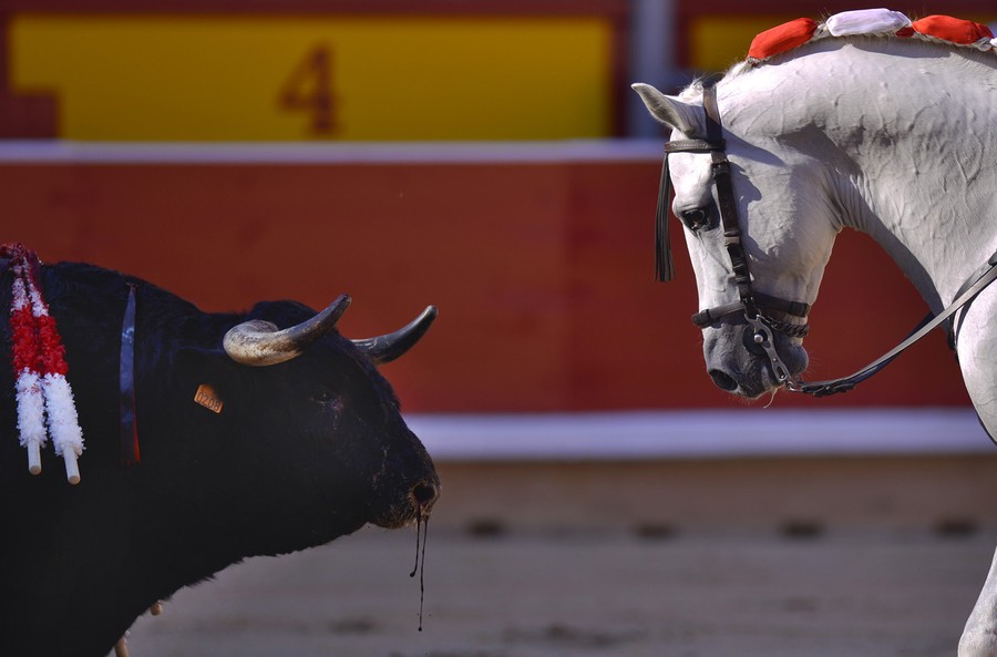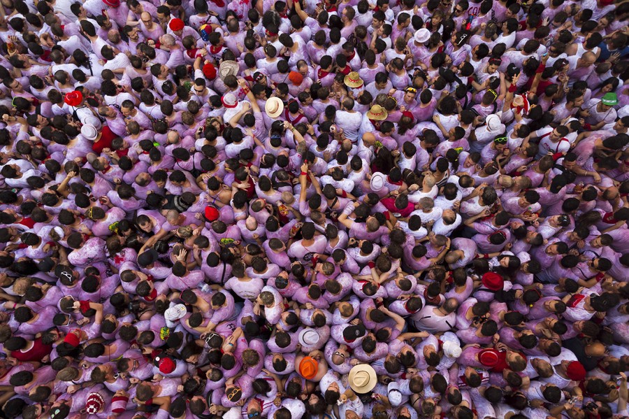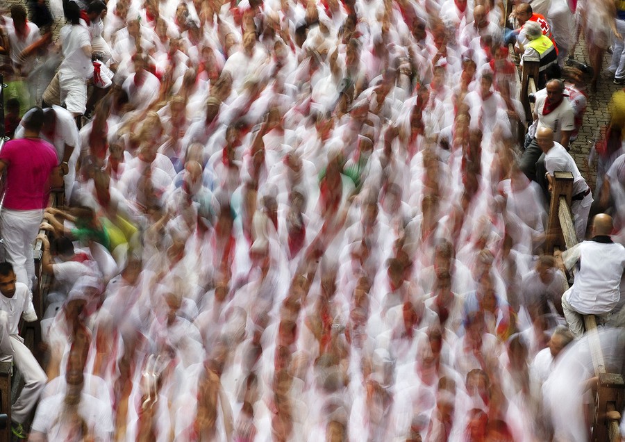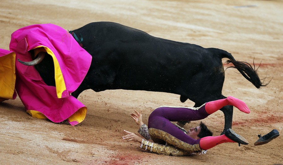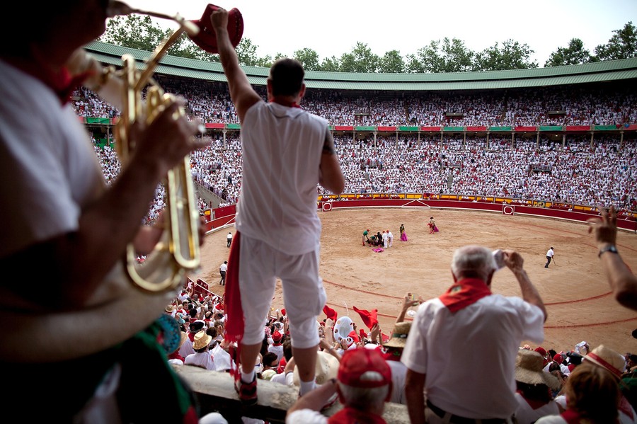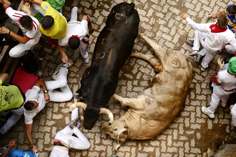 Every year, the Festival of San Fermin, including the "Running of the Bulls", attracts thousands of visitors to Pamplona, Spain. Lasting nine days, the festival kicks off with massive crowds at the Chupinazo in Pamplona town square, followed by a carnival, fireworks, the running of the bulls, and many bullfights. Held since 1591, San Fermin remains a popular, if also dangerous and controversial, event -- dozens of people were injured this year. The festival came to an end yesterday, July 14. Collected here are scenes from this year's Festival of San Fermin.