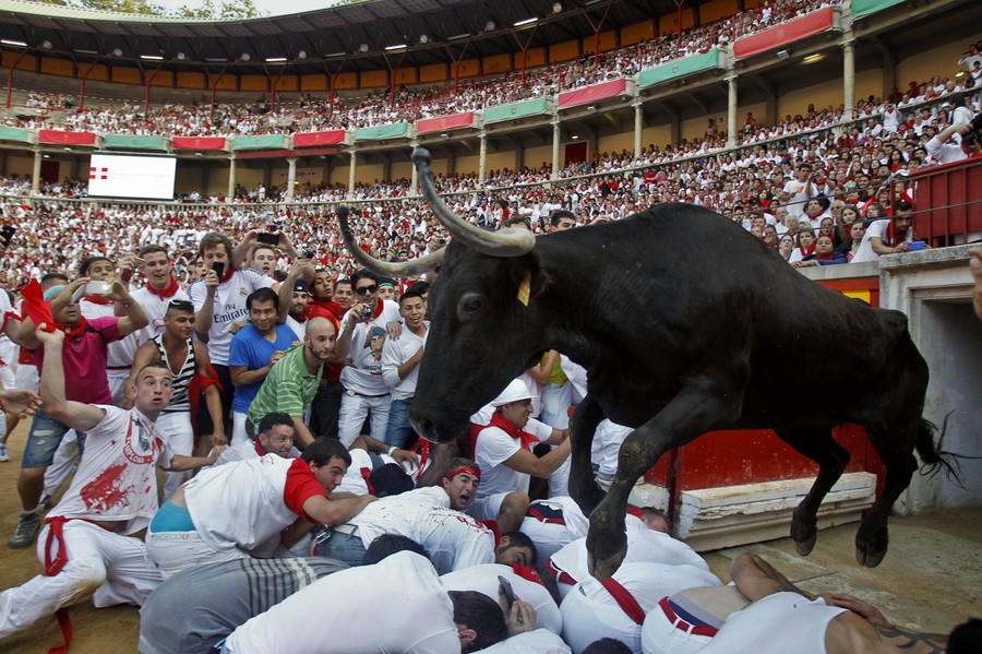 Read moreA fighting cow leaps over festival-goers upon entering the bullring following the first running of the bulls of the San Fermin festival in Pamplona, on July 7, 2013. #