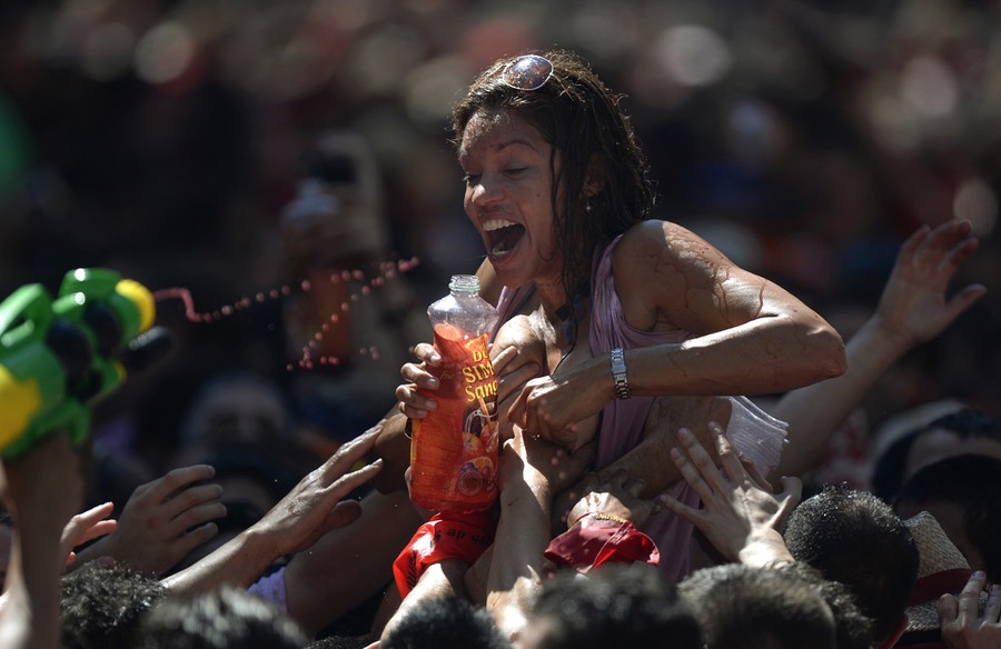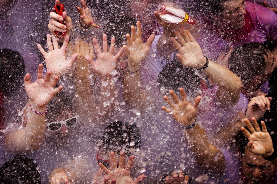 Read moreFestival-goers are sprayed with water thrown from balconies during the launch of the "Chupinazo" rocket, to celebrate the official opening of the 2013 San Fermin fiestas, on July 6, 2013 in Pamplona. #