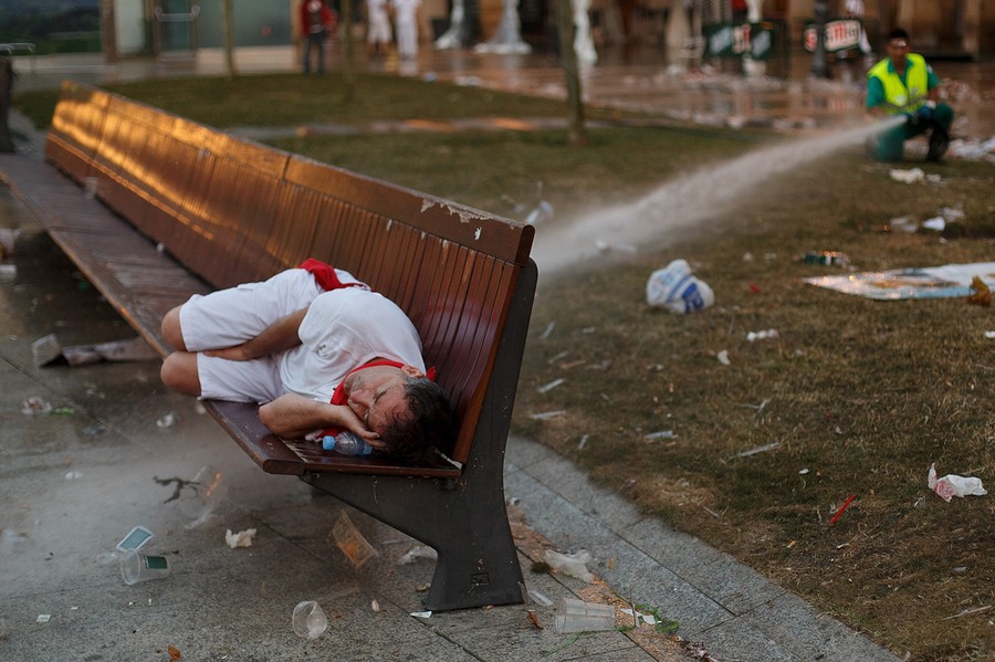 Read moreA festival-goer sleeps on a bench as cleaning operators work at Plaza del Castillo in the early hours ahead of the Running Of The Bulls, on July 9, 2013 in Pamplona. #