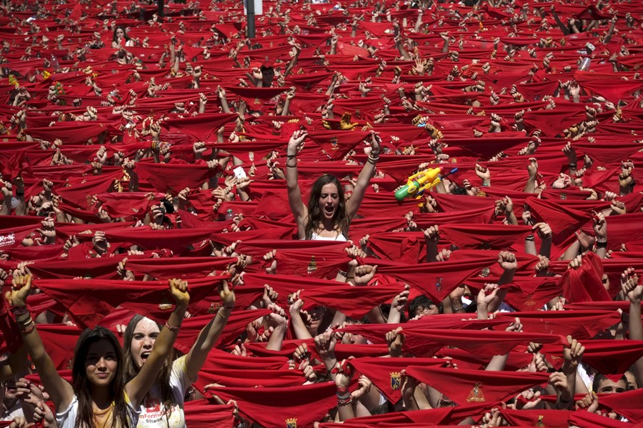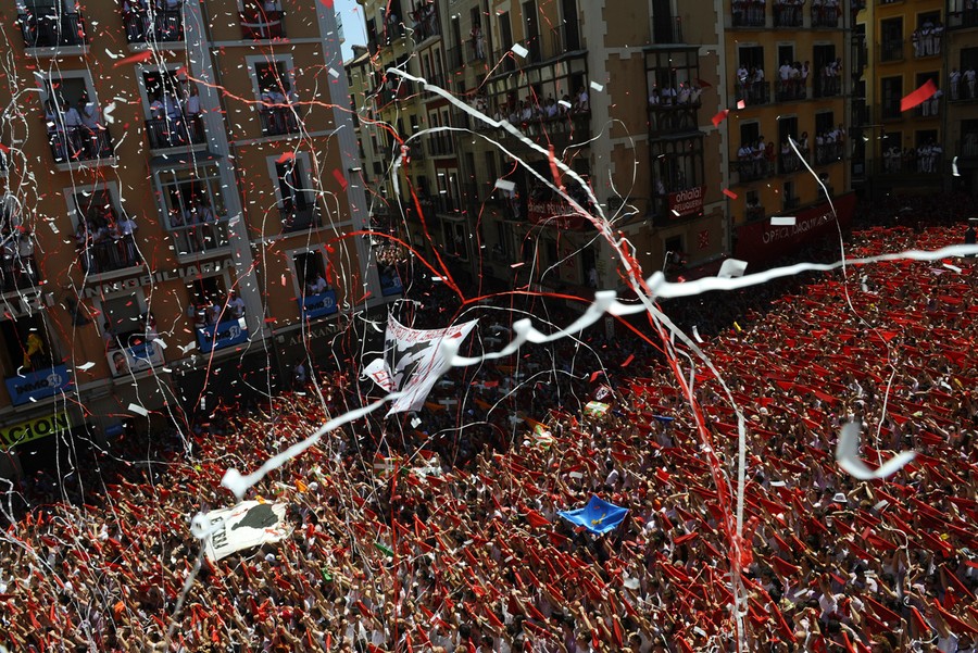 Read moreParticipants hold red scarves as they celebrate the "Chupinazo" marking the start of the San Fermin Festival at Castle square in Pamplona, Spain, on July 6, 2013. Tens of thousands of people packed Pamplona's streets for a drunken kick-off to Spain's best-known fiesta. #