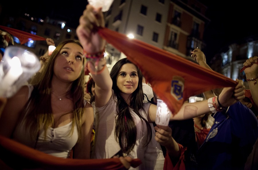 Read moreRevelers raise red scarves and candles as they sing the traditional song "Pobre de Mi" (Poor Me) in the city council building, marking the end of the San Fermin Festival, on July 15, 2013. #