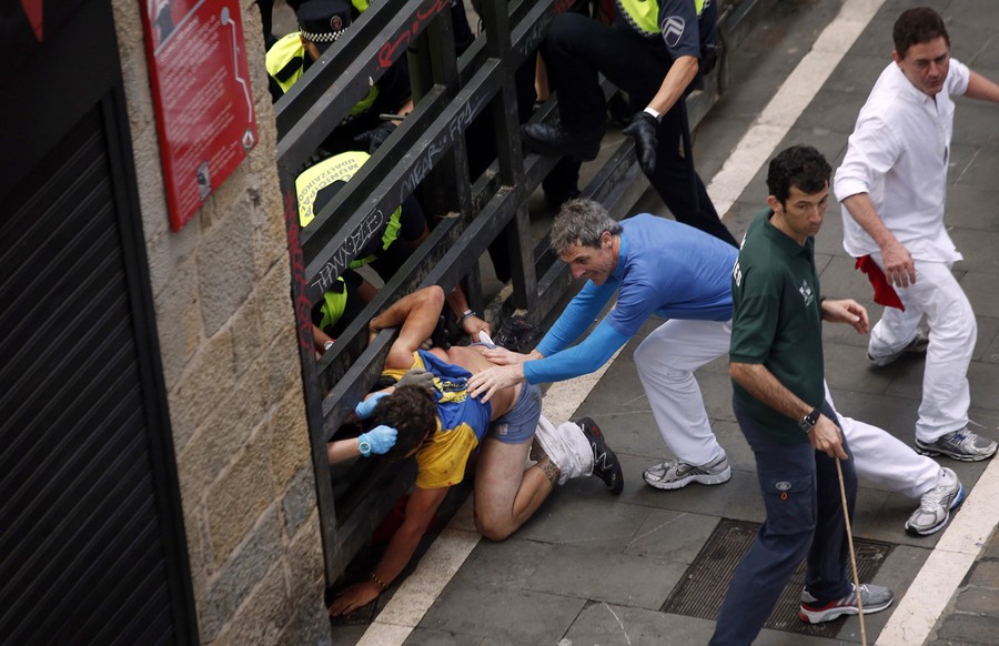 Read more(4 of 4) Diego Miralles is helped through a barrier by police and a fellow runner to receive medical treatment, on July 12, 2013. Four runners were gored in a run that lasted four minutes and fifty seven seconds, according to local media. Miralles, who was gored three times, was taken to a nearby hospital for surgery. #
