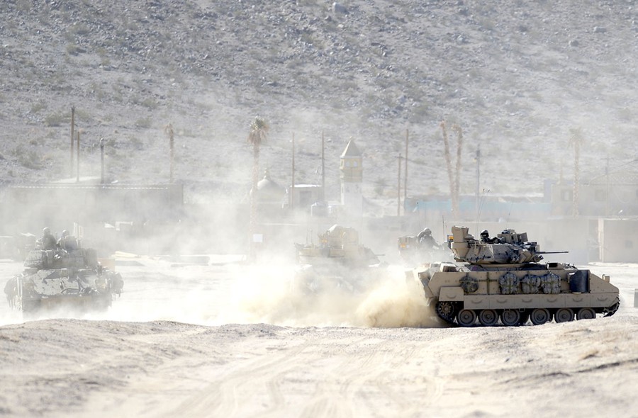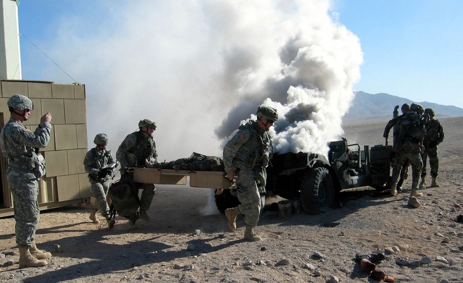 Read moreA simulated improvised explosive device (IED) explodes during a mass-trauma training exercise at Medina Wasl, a training village at the National Training Center on Fort Irwin. #