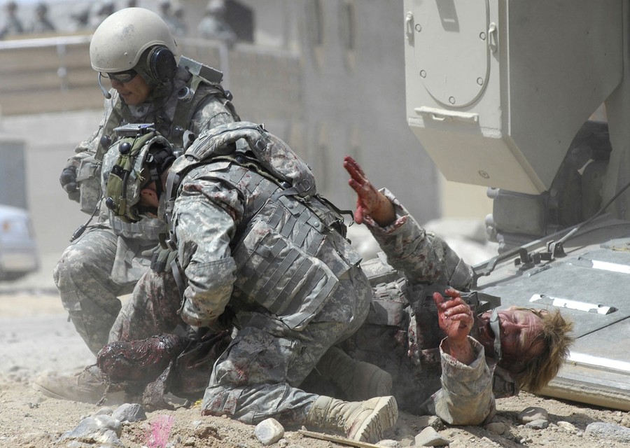 Read moreCombat medics and members of a convoy security detachment, 204th Brigade Support Battalion, 2nd Brigade Combat Team, 4th Infantry Division, rush a wounded soldier to a waiting medic vehicle for treatment during medical combat and triage training in a simulated Iraqi village at the National Training Center, on May 1, 2008. #