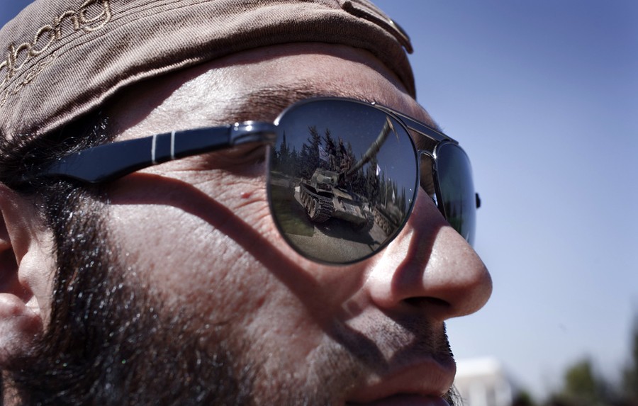 Read moreA tank is reflected in the sunglasses of a rebel fighter during a ceremony to mark an agreement to unite the of forces Liwaa al-Tawid and Liwad al- Fatah brigades on September 13, 2013 at a former military academy north of Aleppo. #