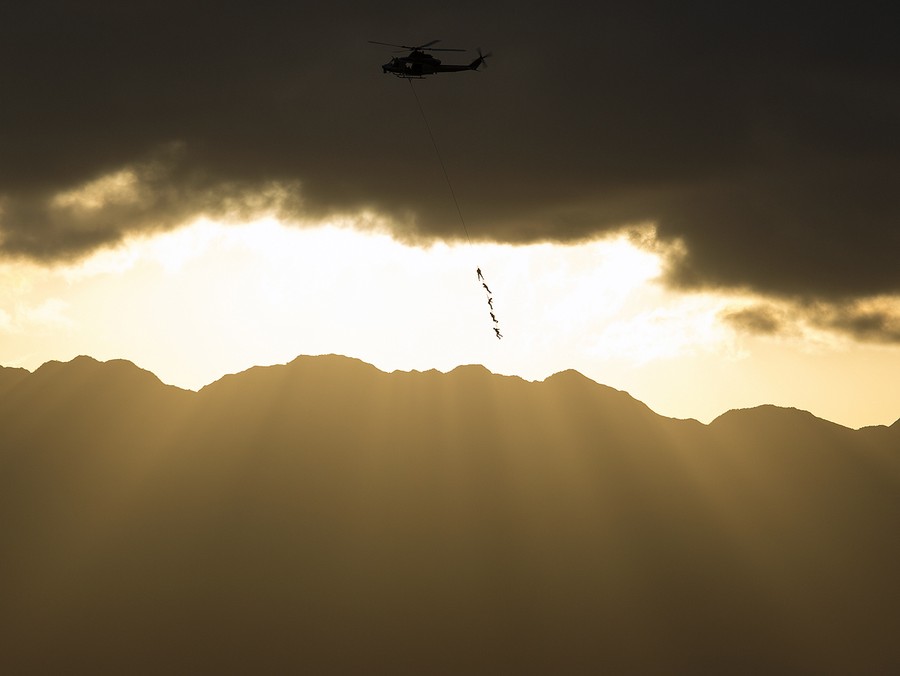 Read moreA UH-1Y Huey helicopter flies U.S. service members across the horizon near Marine Corps Air Station Kaneohe Bay, Hawaii, during a special patrol insertion and extraction rigging exercise, on May 13, 2014. The exercise was conducted as part of the Helicopter Rope Suspension Training Master's Course, a 10-day course to train U.S. service members to land on the ground quickly in situations where aircraft may have difficulty landing. #