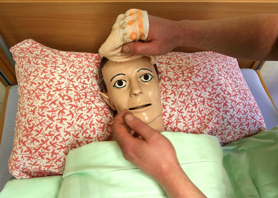 Read moreStudent Frank Schreiber gives a sponge bath to a mannequin named Frau Schmidt, a mock patient used in an elderly care training program at the Edith Stein Catholic vocational training center on May 14, 2014 in Berlin, Germany. The supply of caregivers for the elderly in Germany has not met the demand, as an aging population finds itself in need of qualified nurses. According to one study, estimates hold that there will be a shortage of up to 152,000 caregivers by the year 2025. Due to low fertility rates and increased longevity, the elderly population of the country is predicted to increase from 7% of the total population in the previous century to over 10% by the year 2020. #