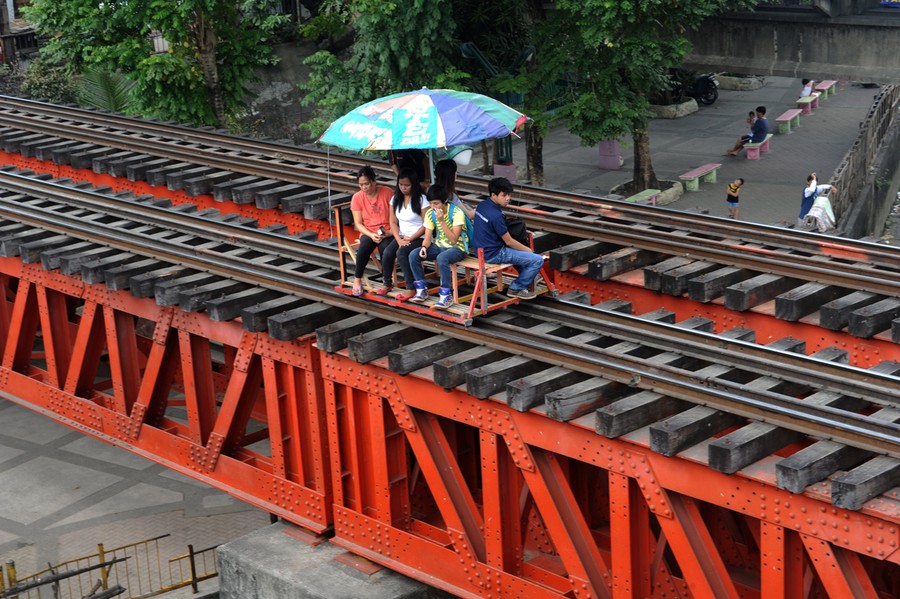 Read morePeople ride on a makeshift trolley that is pushed on the rails of the Philippine railroad in Manila, Philippines. Small-time entrepreneurs push commuters on their trolleys, charging a small fee for transporting them short distances, earning an average of about 6.75 USD a day, despite the potential threat they face from the trains that also use the rails. Usually, when a train is approaching, the passengers and operator of the trolley just get down, lift their vehicle off the rails and let the train go by. #