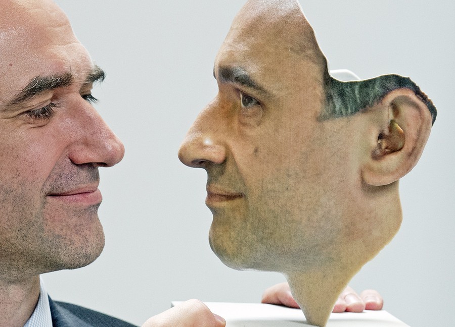 Read moreMario Huettenhofer, chief of the German company 3D Fab, presents his own face as a 3d print during the international fairs FabCon 3.D and Rapid.Tech in Erfurt, Germany, on May 15, 2014. #