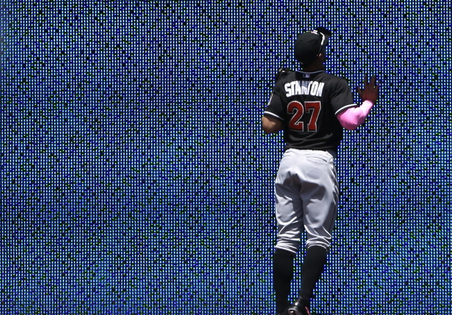 Read moreMiami Marlins right fielder Giancarlo Stanton runs into a digital display on the outfield wall as he watches a home run hit by San Diego Padres' Will Venable during the first inning in San Diego, California, on May 11, 2014. #