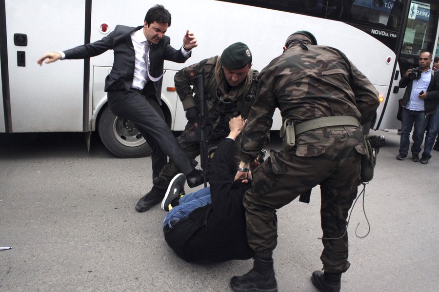 Read moreA protester is kicked by Yusuf Yerkel (left), advisor to Turkey's Prime Minister Tayyip Erdogan, as Special Forces police officers detain him during a protest against Erdogan's visit to Soma, a district in Turkey's western province of Manisa, on May 14, 2014. Four Turkish labor unions called for a national one-day strike on Thursday in protest against the country's worst industrial disaster that killed at least 282 people in a coal mine in western Turkey. #