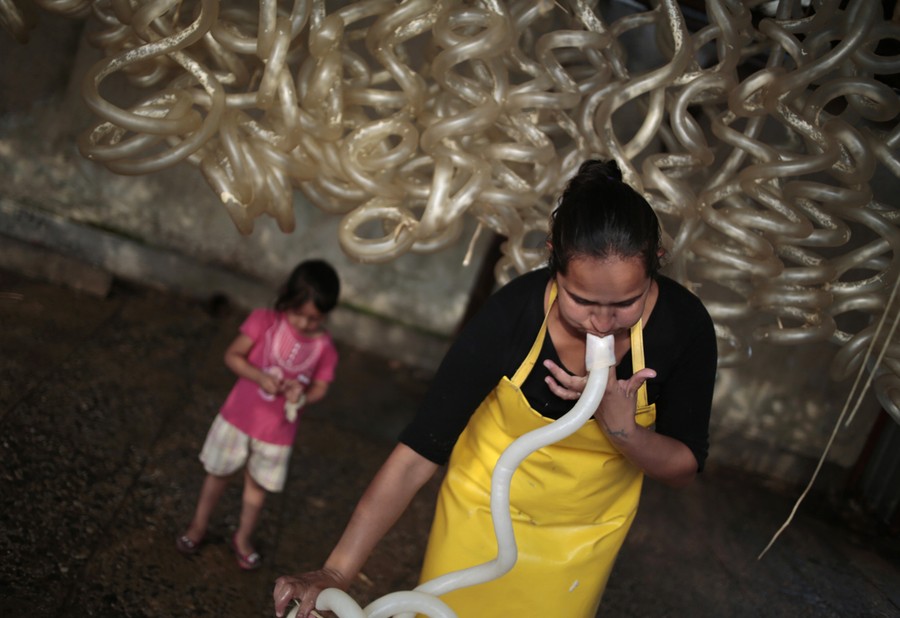 Read moreHeidi, 27, cleans and inflates cow intestines which will be used for sausages as her daughter stands behind her, in the "Cholojeros" zone next to the railway lines in Zona 18, Guatemala City, on May 7, 2014. Most of the beef consumed in the city is produced in the Cholojeros zone, according to the Ministry of Agriculture Livestock and Food (MAGA) of Guatemala. The long-standing area got its name from the word "cholojo", which means animal intestines. #