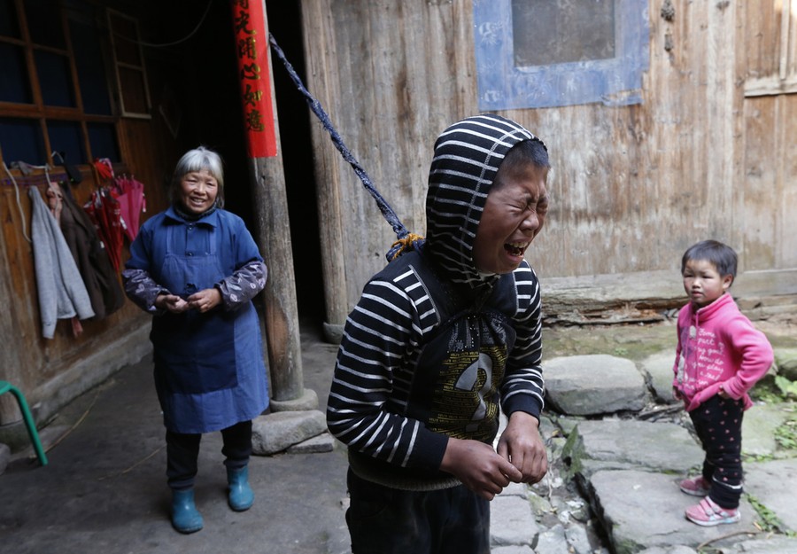 Read moreXie Guobiao, 11, tied to a pillar with a rope, cries as his grandmother and younger sister look on at his home in Daohui village of Lishui, Zhejiang province, China, on May 7, 2014. Xie was diagnosed as mentally handicapped when he was young, but the family was not able to provide him with sufficient medical treatment due to their poverty. At the age of six, Xie started to sneak out of his home when others were not looking, climbing on top of houses and smashing windows. Xie's family had to pay over 10,000 yuan ($1,606) in compensation to others for the damage he caused. Since then, the family has had to tie Xie up with a rope both at home and in public, they said. #