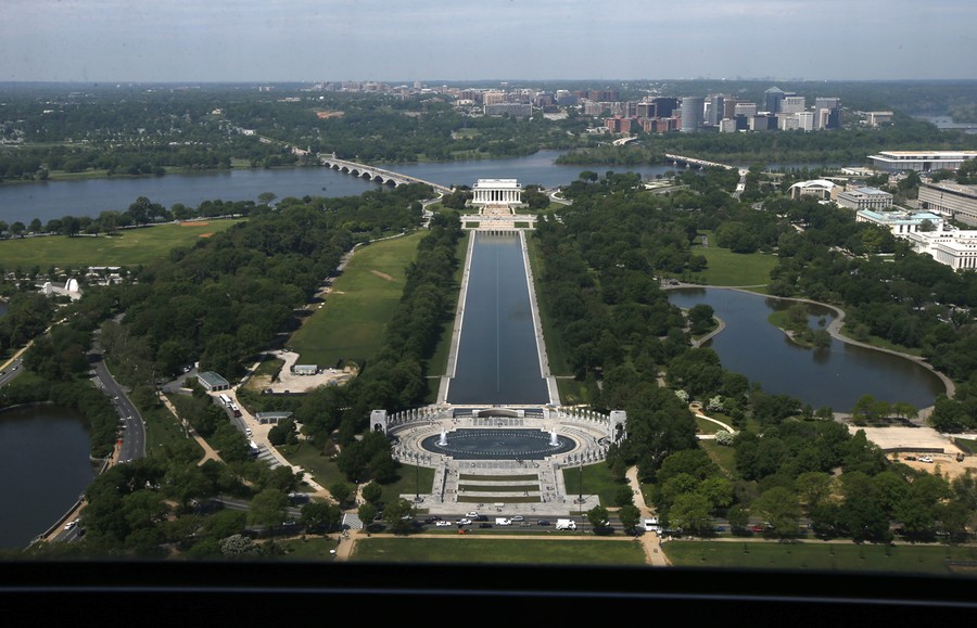 Read moreViewed from the 500-foot level of the newly-reopened Washington Monument, the Lincoln Memorial, rear, and the National World War II Memorial below, in Washington, District of Columbia, on May 12, 2014. The monument, which sustained damage from an earthquake in August 2011, reopened to the public on the 12th. #