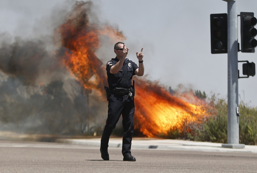 Read moreA Carlsbad, California police officer turns traffic away as flames leap behind him on May 14, 2014. Weather conditions that at least temporarily calmed allowed firefighters to gain ground early Wednesday on a pair of wildfires that forced thousands of residents to leave their homes. #