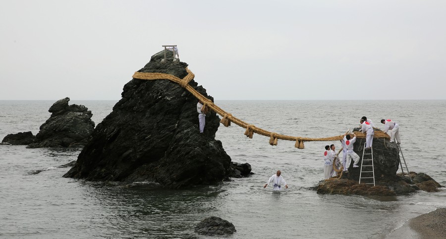 Read moreJapanese Shinto shrine priests hang the Shimenawa, Sacred ropes strung between God Married Stones, during the Oshimenawahari ceremony of Meoto-iwa or the Couple Rock at Futami Okitama Shrine on May 5, 2014 in Ise, Japan. The Oshimenawahari ceremony is held three times a year to replace the heavy rope of rice straw that connects the Couple Rock. The Couple Rock serves as a gate to the Okitama Shrine, dedicated to the god Sarutahiko and goddess Ukanomitama from Japanese myth. #