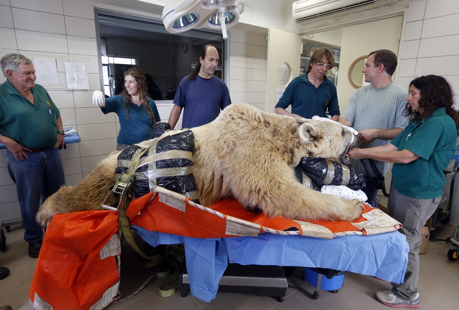 Read moreZoo staff stand beside Mango, a 19-year-old Syrian brown bear, during preparations before his surgery at the Ramat Gan Safari near Tel Aviv, on May 7, 2014. Mango suffers from a slipped disk, impairing his mobility and causing pain and was set to undergo complicated and unprecedented surgery on his spine in the hope of improving his quality of life, a zoo spokesperson said. #