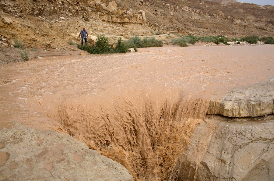 Read moreAn Israeli man watches water flooding through the Nahal Zin valley in the Arabah desert following heavy rainfall across Israel, including in the southern Israeli Negev desert area, on May 8, 2014. #