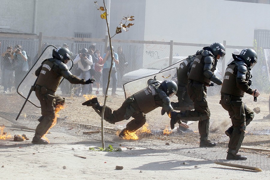 Read moreA Chilean riot police officer trips and falls as he and his fellow officers run from a petrol bomb thrown by protesters in violent clashes, during a student march in Santiago, Chile, on May 8, 2014. Tens of thousands of students protested in Chile in the first march demanding education reform since President Michelle Bachelet took power on promises of deep changes. #