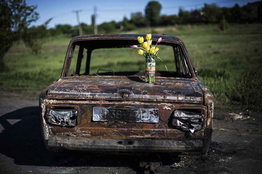 Read moreA bouquet of flowers is placed atop the burnt out shell of a car where clashes between pro-Russian gunmen and the Ukrainian army took place, four kilometers (2.5 miles) north of Slovyansk, Ukraine, on May 7, 2014. #