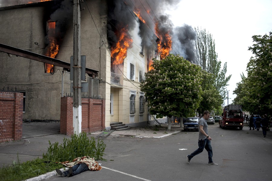 Read moreThe body of a police officer, left, lies outside a police station in Mariupol, eastern Ukraine, on May 9, 2014. Fighting between government forces and insurgents in Mariupol has left several people dead. #