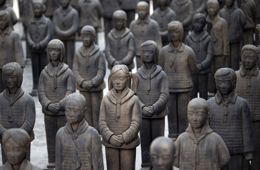 Read moreDetails of the "Terracotta Daughters", a work of art by French visual artist Prune Nourry, exhibited at "Le Centquatre" art space in Paris until June 1, 2014. In the continuation of her "Holy Daughters" project in India, Prune now reflects upon gender preference in China and how it infiltrates local culture through the familiar symbol of the Terracotta Soldiers, by creating an army of 116 life-size Terracotta Daughters that will go on a world tour before returning to China in 2015, where they will be buried in a secret place that will be revealed in 2030. Photo taken on May 9, 2014. #