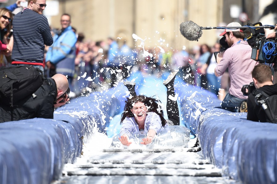Read moreA participant takes part in the Bristol Park and Slide project, an interactive temporary installation by artist Luke Jerram set up in Park Street in the center of Bristol, England, on May 4, 2014. Over 95,000 people applied for just 360 tickets to slide on inflatable air mattresses down a lubricated water slide in a town center street. #