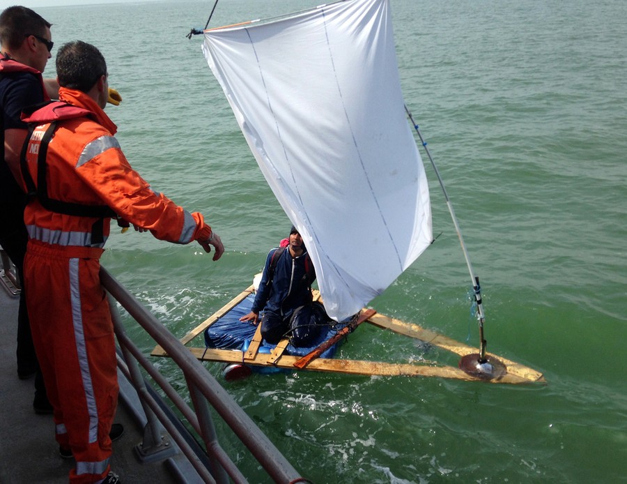 Read moreFrench coast guard rescuers assist a 23-year-old Afghan trying to cross the Channel on a makeshift raft using a bedsheet as a sail, on May 5, 2014 off Sangatte. The man, who had started developing hypothermia, "was first disappointed and then glad at being rescued," said Bernard Barron, the head of the coast rescue service in Calais. #