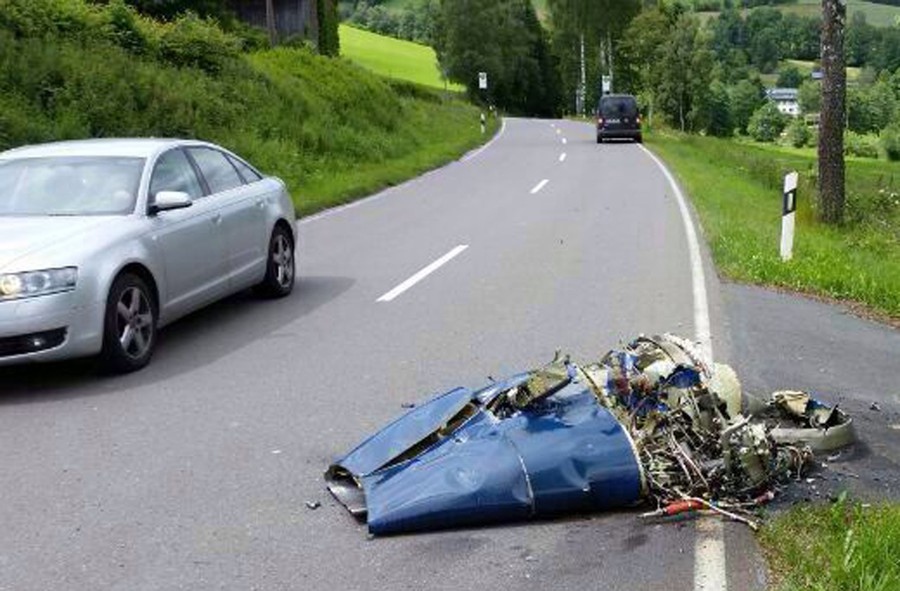 Read moreIn this photo taken by a passerby with a mobile phone, a car drives past wreckage from a Learjet that crashed following a collision with a Bundeswehr Eurofighter on June 23, 2014 near Elpe, Germany. According to initial reports the Eurofighter managed to return to its base but the Learjet crashed and burned and its two occupants were missing and feared dead. #