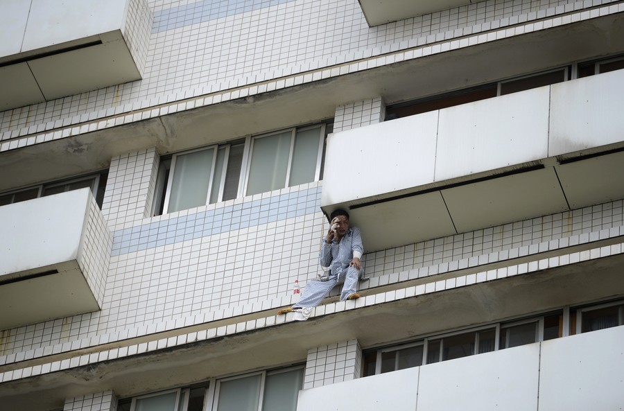 Read moreA patient sits outside a hospital building in Changsha, Hunan province, China, on June 25, 2014. Firefighters saved the patient who broke a window on the eighth floor and attempted suicide. The patient was sent to the hospital after a car accident and was confirmed having mental aberrations. #