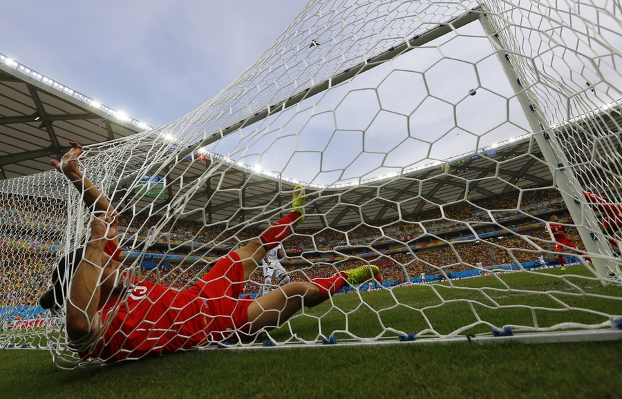 Read moreSwitzerland's Ricardo Rodriguez falls into the goal net after making a save during their 2014 World Cup Group E soccer match against Honduras at the Amazonia arena in Manaus on June 25, 2014. #