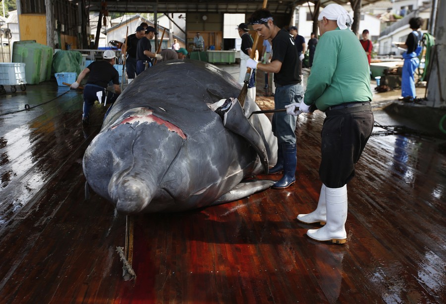 Read moreWorkers carve into the body of a Baird's Beaked whale at Wada port in Minamiboso, southeast of Tokyo, on June 26, 2014. To mark the start of Japan's whaling season, workers in the coastal town of Minamiboso carved up one of the animals as a crowd of grade school students and residents watched, with free samples of its fried meat handed out later. #