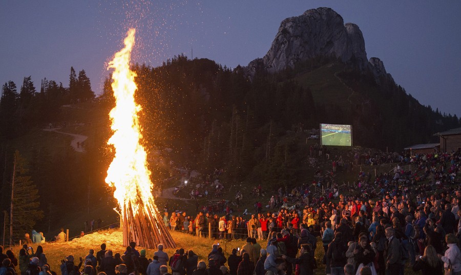 Read morePeople gather around a bonfire and watch the 2014 World Cup Group G soccer match between Germany and Ghana on an outdoor screen, during the Sonnwendfeuer (Midsummer) Festival at Mt. Kampenwand in Bavarian Alps, Aschau, 100 km (62 miles) south of Munich, on June 21, 2014. #