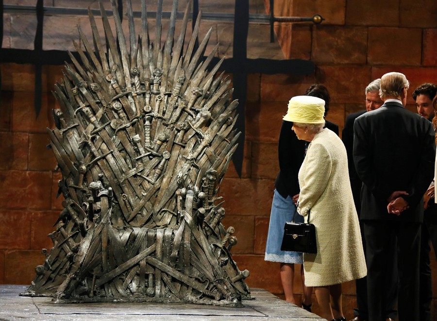 Read moreBritain's Queen Elizabeth looks at the Iron Throne as she meets members of the cast on the set of the television series "Game of Thrones" in the Titanic Quarter of Belfast, Northern Ireland, on June 24, 2014. #
