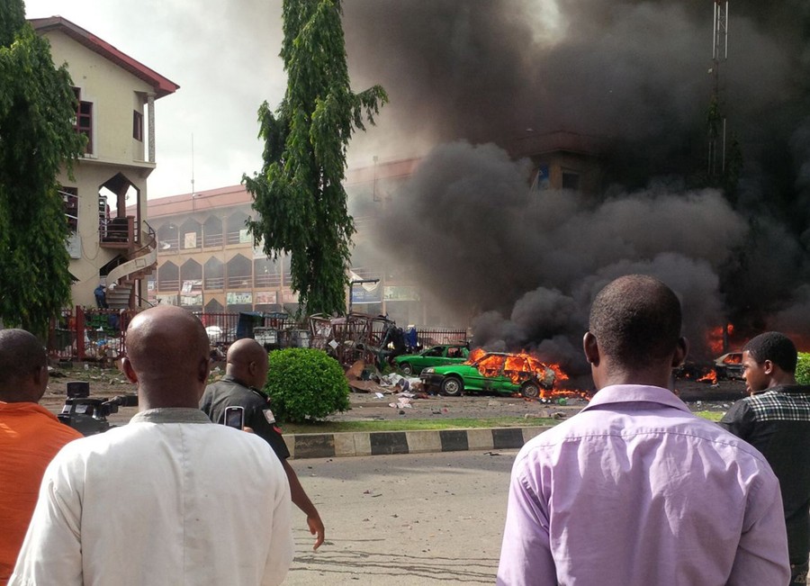 Read morePeople watch as smoke fills the sky, after an explosion, at a shopping mall in Abuja, Nigeria, on June 25, 2014. The explosion rocked a shopping mall in Nigeria's capital and police say at least 20 people were killed and many wounded. #