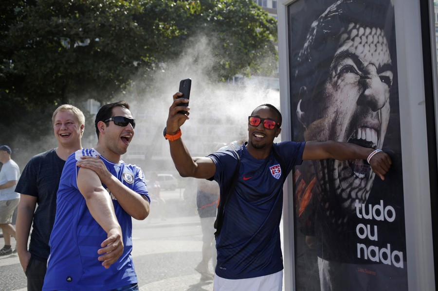 Read moreA U.S. soccer fan pretends that Uruguay's soccer striker Luis Suarez is biting him as he takes a selfie next to an Adidas advertisement featuring Suarez near Copacabana beach in Rio de Janeiro on June 26, 2014. FIFA banned Suarez from all football activities for four months on Thursday for biting an opponent at the World Cup, a punishment that rules him out of the rest of the tournament. #