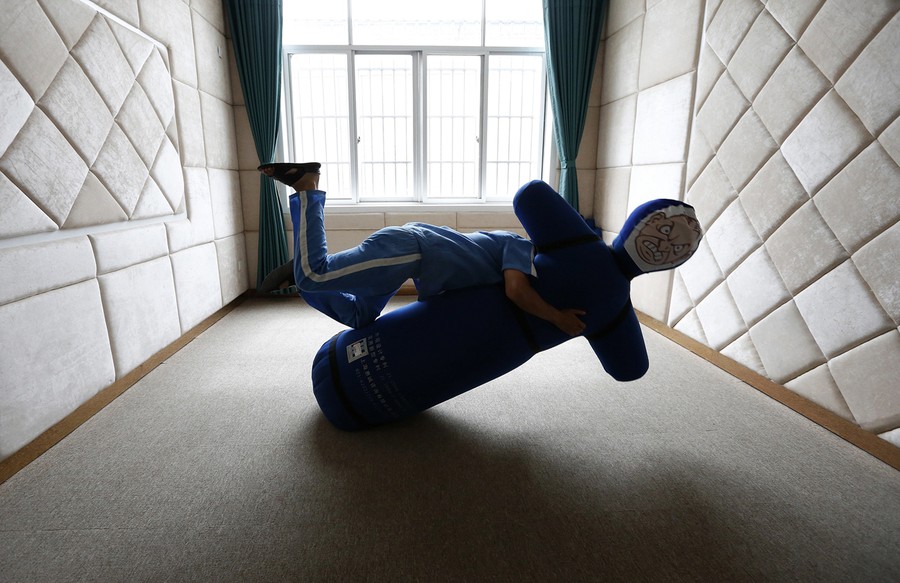 Read moreA recovering drug addict wrestles with a punching dummy to unleash pent-up anger during a psychological therapy at the Shiliping compulsory drug rehabilitation center in Longyou county, Zhejiang province, China, on June 19, 2014. Established in 2008, the center is one of the biggest in China in terms of numbers of inmates and facilities. Recovering drug addicts in the center are undergoing treatment with a strict regime in physical exercises, psychological therapies and medication, according to local media. #